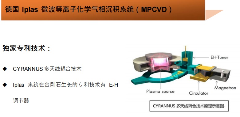 MPCVD 法是在微波能量的作用下,將沉積氣體激發(fā)成等離子體狀態(tài),在由微波產(chǎn)生的電磁場(chǎng)的作用下,腔體內(nèi)的電子相互碰撞并產(chǎn)生劇烈的振蕩,促進(jìn)了諧振腔內(nèi)其它的原子、基團(tuán)及分子之間的相互碰撞,從而有效地提高反應(yīng)氣體的離化程度,達(dá)到輝光發(fā)電,產(chǎn)生更高密度的等離子體。德國 iplas公司的獨(dú)家專利多天線耦合微波等離子技術(shù)(CYRANNUS®),可在反應(yīng)腔中實(shí)現(xiàn)極高的 SP3 鍵轉(zhuǎn)化率,使得腔體中充滿過飽和原子氫和含碳基團(tuán),從而有效地提高了沉積速率并且使得金剛石的沉積質(zhì)量得到改善,這正是獲取優(yōu)質(zhì)金剛石的技術(shù)基礎(chǔ)。德國 iplas 推出的微波等離子化學(xué)氣相沉積系統(tǒng)(MPCVD),其真空室的形式為金屬腔-石英管一體式,壓力操作范圍從 10mbar 到室壓范圍,可制備大尺寸、優(yōu)質(zhì)金剛石(工藝參數(shù)得當(dāng)可制備出首飾級(jí)鉆石)和高均勻性的金剛石厚膜。