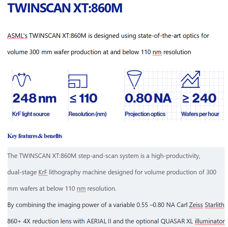 The TWINSCAN XT:860M step-and-scan system includes a variable 0.80 NA 248 nm 860+ projection lens to attain very low aberration levels for tight focal planes and excellent distortion control with annular distortion of ≤ 10 nm.