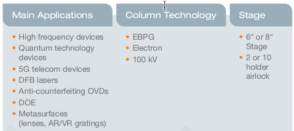 新的EBPG系列系統(tǒng)是多年系統(tǒng)發(fā)展的最新進(jìn)展。EBPG Plus系統(tǒng)在工業(yè)化合物半導(dǎo)體制造中已得到廣泛應(yīng)用,并且是世界頂尖大學(xué)和納米技術(shù)研究卓越中心的系統(tǒng)首選。