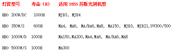 燈管型號 壽命(H) 適用SUSS蘇期光刻機型