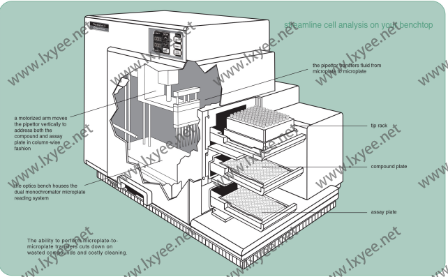 FlexStation的體積公相當(dāng)于普通酶標(biāo)儀的大小,但其細(xì)胞水平功能分析十分靈活。該系統(tǒng)所使用的試劑合與高通量篩選儀器Flipr相同,儀器設(shè)置和數(shù)據(jù)分析方法相同,數(shù)據(jù)一致性很好,可在兩系統(tǒng)之間方便的轉(zhuǎn)移。