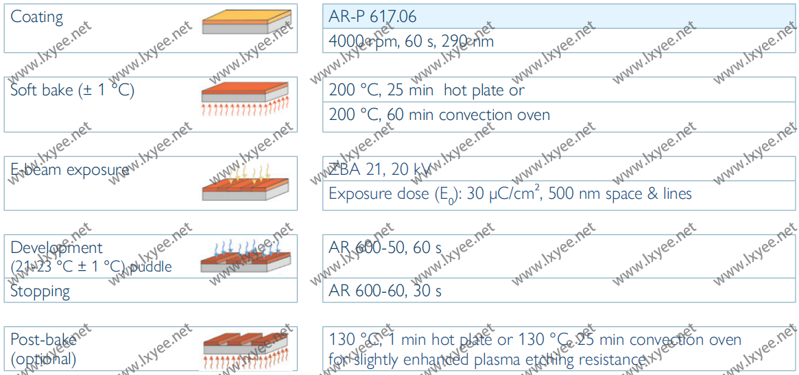 該圖顯示了AR-P 610系列電阻的典型工藝步驟。所有規(guī)范都是指導(dǎo)原則必須適應(yīng)自身具體情況的價(jià)值觀。For 進(jìn)一步 信息 processing, ? “Detailed 電子束電阻的最佳處理說(shuō)明"。For 建議 廢水 處理 和 general 安全 instructions, ? ”General 產(chǎn)品 信息 Allresist 電子束 resists”.