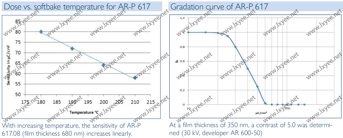抗蝕劑的敏感性隨軟烤溫度的升高而增加,這是因?yàn)榭刮g劑的形成更加強(qiáng)烈下 的 甲基 丙烯酸 酐 的 分離 水 (? 圖 劑量 與 softbake temperature).AR-P 617,因此,在200℃回火比在180℃回火大約敏感20%。劑量可以是對(duì)兩層AR-P 617系統(tǒng)進(jìn)行相應(yīng)的調(diào)整,對(duì)于兩層系統(tǒng)具有重要意義。在這種情況下,首先,底層在200℃下干燥,然后在180℃與上層膜一起回火。由于差異化的過(guò)程,較低的層次被開(kāi)發(fā)人員更快地攻擊,并明顯削弱結(jié)構(gòu)形成(起飛)。這些起飛結(jié)構(gòu)也可以由雙層系統(tǒng)PMMA/共聚物。首先在190℃下對(duì)ar - p617進(jìn)行涂層回火處理,然后對(duì)其進(jìn)行PMMA抗AR-P 679.03紡絲涂膜,150℃烘干。曝光后,兩層都是一步顯影,如AR 600-56處理瓶塞AR 600-60并沖洗。