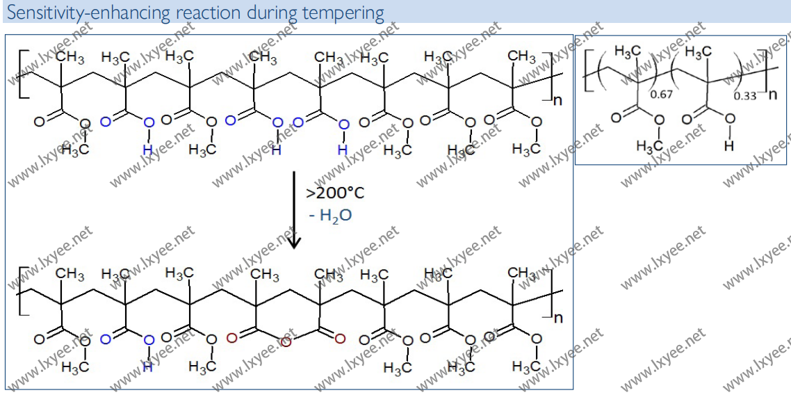 由甲基丙烯酸甲酯和甲基丙烯酸組成的共聚物與純PMMA產(chǎn)品相比,在熱載荷作用下能形成6環(huán)。在這種情況下,兩個(gè)甲基丙烯酸基團(tuán)必須相鄰排列在聚合物鏈上(見(jiàn)大的結(jié)構(gòu)式左),這在統(tǒng)計(jì)學(xué)上發(fā)生足夠高混合比例為2:1時(shí)的頻率(見(jiàn)右上方分子式)。在這個(gè)溫度下反應(yīng)是可能的,因?yàn)樵诜磻?yīng)過(guò)程中產(chǎn)生的水是非常好的離開(kāi)組織。