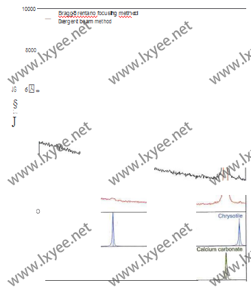 0.1 質(zhì)量分?jǐn)?shù)% 石棉 (溫石棉) 分散于碳酸鈣中 一束發(fā)散的X射線經(jīng)過平面鏡單色后進(jìn)行衍射實(shí) 驗(yàn) ,相比于傳統(tǒng)的 Bragg-Brentano聚焦光路模 式,可以獲得更高的信背 比。從衍射實(shí)驗(yàn)結(jié)果中可