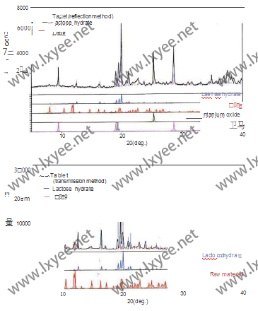 分別用反射法和透射法測試藥 片的X射線衍射峰 藥物片劑一般由含有甜昧的輔料及可食用色素構(gòu) 成,可以有效的降低藥片在吞咽時的苦澀感。藥片 表面的成分可以通過反射法進(jìn)行測試 ,而藥片內(nèi)部的信息可以通過透射法獲得。