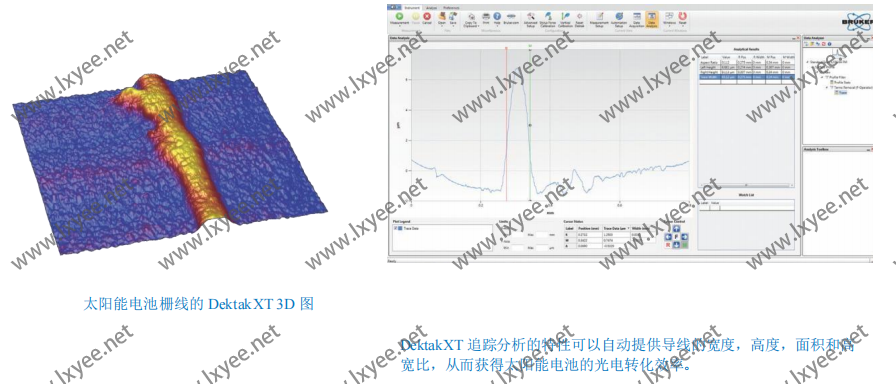 在太陽(yáng)能領(lǐng)域,Dektak 已被作為測(cè)量單晶和多晶硅電池上主柵、銀線(xiàn)特征尺寸的首選設(shè)備。柵線(xiàn)的高度、寬度和連續(xù)性都直接影響了太陽(yáng)能電池的能量傳輸能力。生產(chǎn)過(guò)程中的最佳方案是節(jié)約貴金屬銀的使用量,同時(shí)又保證銀漿的量足夠覆蓋在電池板上,完成最 佳的電導(dǎo)特性。 DektakXT 可使用線(xiàn)條分析功能為用戶(hù)提供柵線(xiàn)的特征尺寸,以確保足夠的銀漿覆蓋,導(dǎo)電良好。Vision64 的數(shù)據(jù)分析方法和自動(dòng)操作功能使這一檢驗(yàn)核實(shí)的過(guò)程可以通過(guò)特定設(shè)置后自動(dòng)完成。