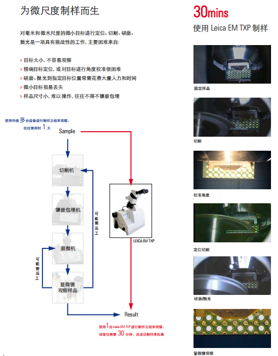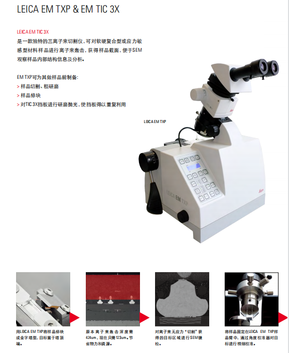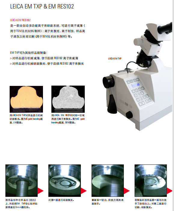 是一款獨(dú)特的可對目標(biāo)區(qū)域進(jìn)行精確定位的表面處理工具,特別適合于SEM,TEM及LM觀察之前對樣品進(jìn)行切割、拋光等系列處理。它尤其適合于制備高難度樣品,如需要對目標(biāo)精細(xì)定位或需對肉眼難以觀察的微小目標(biāo)進(jìn)行定點(diǎn)處理。有了 Leica EM TXP,這些工作就可輕松完成。在 Leica EM TXP 之前,針對目標(biāo)區(qū)域進(jìn)行定點(diǎn)切割,研磨或拋光等通常是一項(xiàng)耗時(shí)耗力,很困難的工作,因?yàn)槟繕?biāo)區(qū)域極易丟失或者由于目標(biāo)尺寸太小而難以處理。使用 Leica
