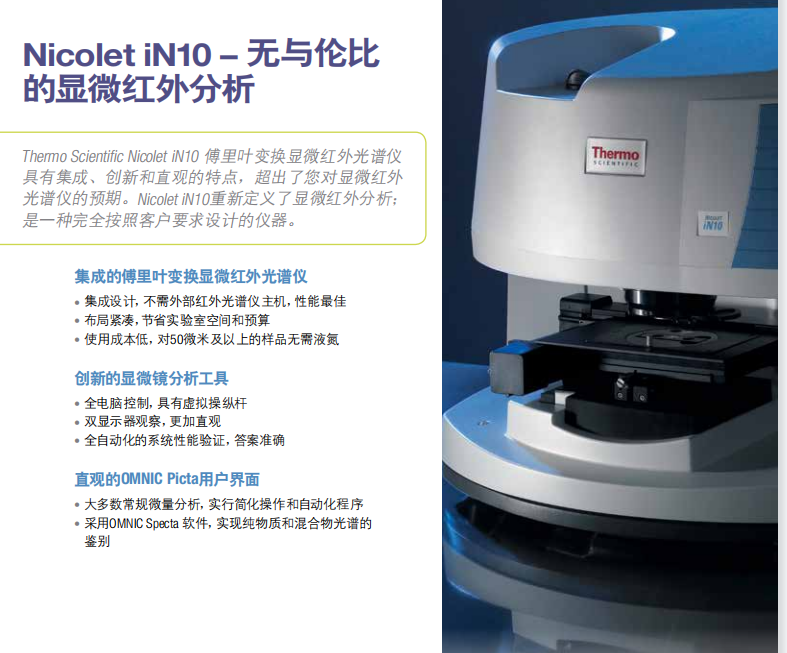 準確進行顯微紅外分析Thermo Scientific Nicolet iN10是一種直觀、創(chuàng)新、集成的一體化傅里葉變換顯微紅外光譜儀,具有安裝簡便、性能卓越、光譜質(zhì)量高的特點。不同于市場上的任何其它顯微紅外光譜儀,Nicolet iN10傅里葉變換顯微紅外光譜儀重新界定了顯微紅外光譜儀的易用性。