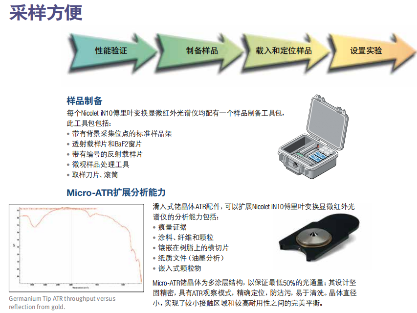 • Thermo ScientificTM Nicolet iZTM10 傅里葉變換紅外光譜儀模塊可以最小的投入,擴展從微量樣品到宏觀分析的采樣能力。您可以隨時升級該模塊。