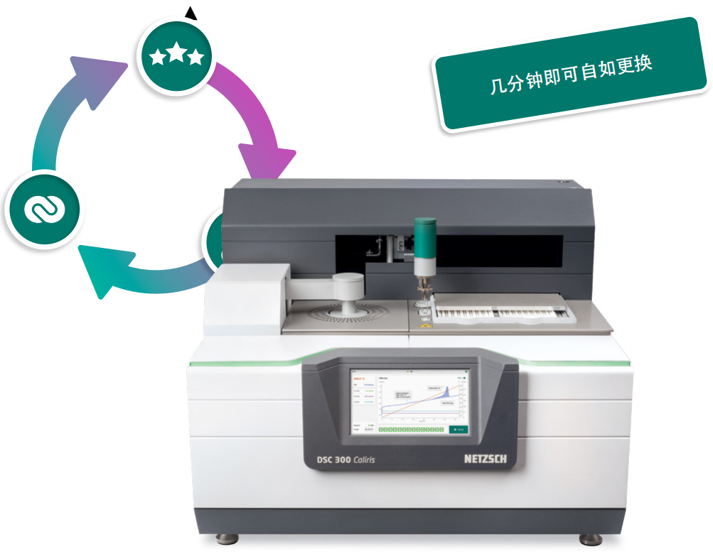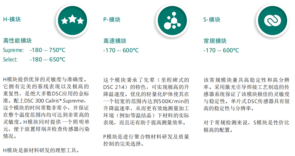 DSC 300 Caliris® Supreme 可以由使用者自行更換模塊以滿足不同階段的測(cè)試需求。根據(jù)您的需求,可以選擇寬廣的溫度范圍(H模塊),極速升降溫速率(P模塊)或者高性價(jià)比(S模塊)。