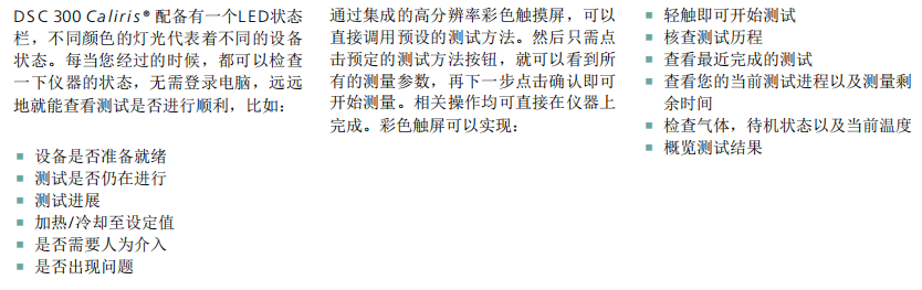 DSC 300 Caliris® 通過(guò)各種方式為您提供完整的測(cè)試信息。DSC 300 Caliris® Supreme和Select都配備有集成化的彩色觸摸屏以及LED狀態(tài)欄。遠(yuǎn)遠(yuǎn)瞥一眼儀器外嵌的LED狀態(tài)欄就能知道儀器的工作狀態(tài)。通過(guò)集成化的觸摸屏,您還可以: