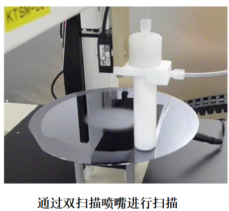 5. 晶圓被轉(zhuǎn)移到掃描工位,專用掃描噴嘴吸入掃描溶液(最多 1.5 毫升)。