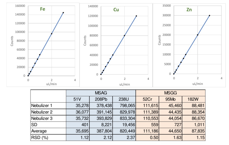 ● 對三種不同的霧化器進行了檢測,流速為 1 微升/分鐘,并獲得了可重復的結(jié)果,這表明引入霧化器的標準溶液的 100%被引入到 ICP-MS 的等離子體中。