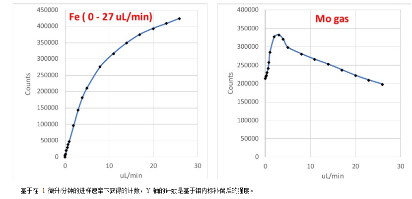 ● 當標準溶液以超過 3 μL/min 的速度進樣時,靈敏度開始下降,這表明一部分標準溶液被困在噴霧室中。