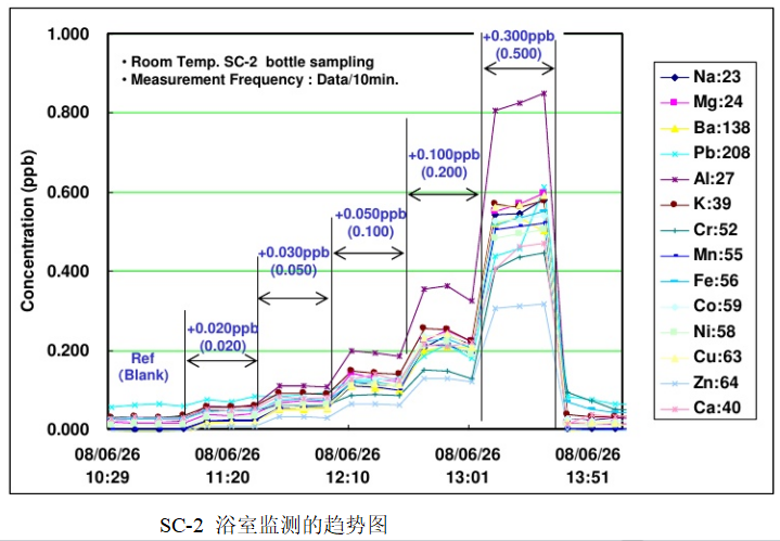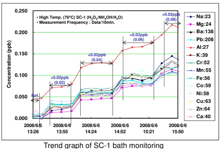 以下是通過 AT 模型(100 微米聚四氟乙烯管)獲得的 SC-1 和 SC-2 化學浴的趨勢圖。在每個化學浴中添加了混合標準溶液。添加標準元素后,檢測到添加的標準元素大約需要兩分鐘。