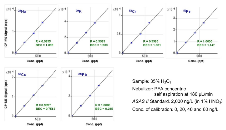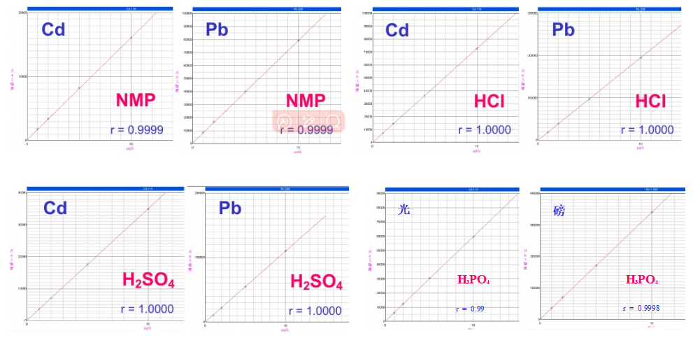 示例:10% NMP(氮甲基吡咯烷酮)、10% HCl(鹽酸)、5% H2SO4(溶劑)、1% H3PO4 霧化器:聚氟乙烯同心式,自吸速率為 200 微升/分鐘 標(biāo)準(zhǔn):0.2 毫克/升(在 1% HNO3) 濃度中) 濃度:1、2、5 和 10 微克/升